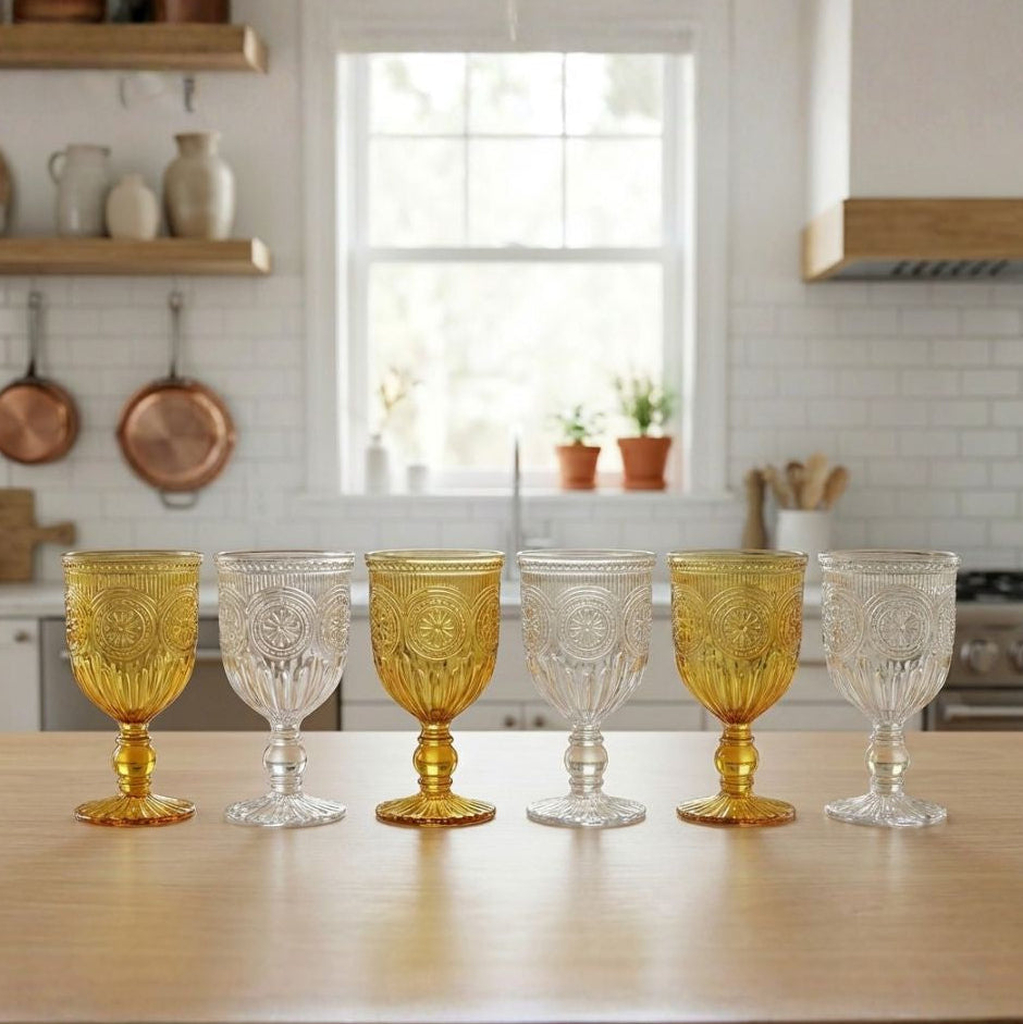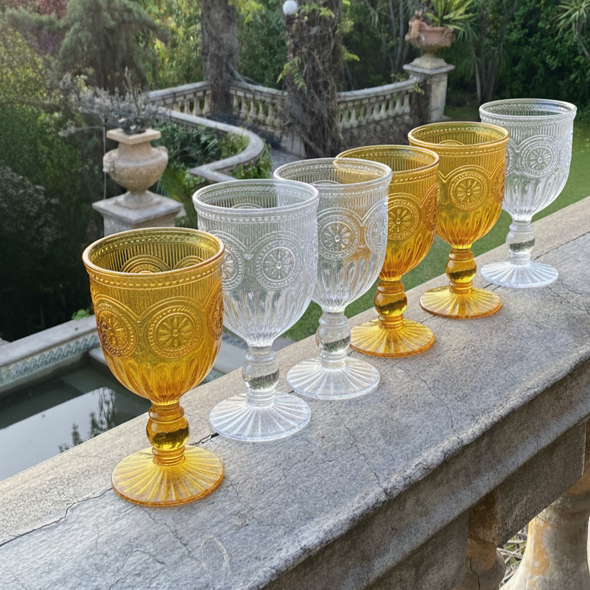 Set de 6 copas de vidrio Mix Sun : una mezcla de tonos dorados y cálidos que reflejan la energía del sol, aportando luminosidad y estilo a tu mesa en cada ocasión. Perfectas para iluminar tus momentos especiales.