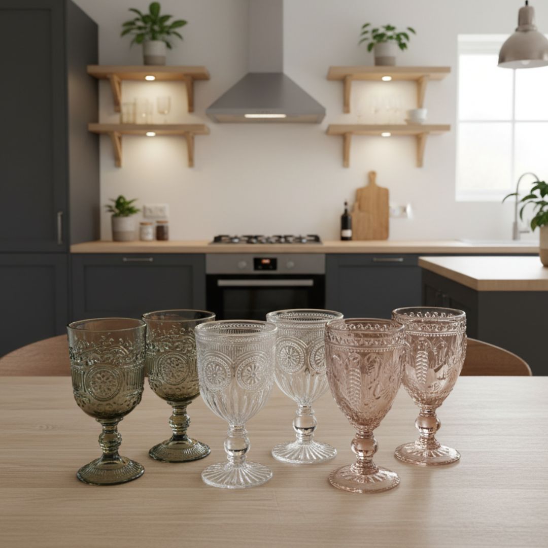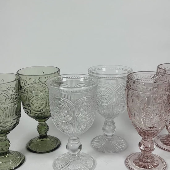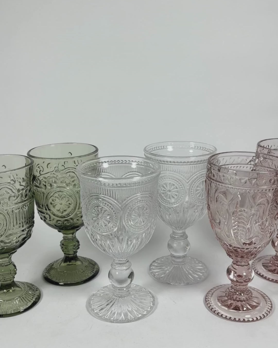 Incluye 2 copas Elefante Rosa, 2 Real Gris y 2 Perla Transparente. Cada una está finamente tallada en vidrio, sin pintura, con delicados relieves que capturan la luz y realzan su belleza natural.